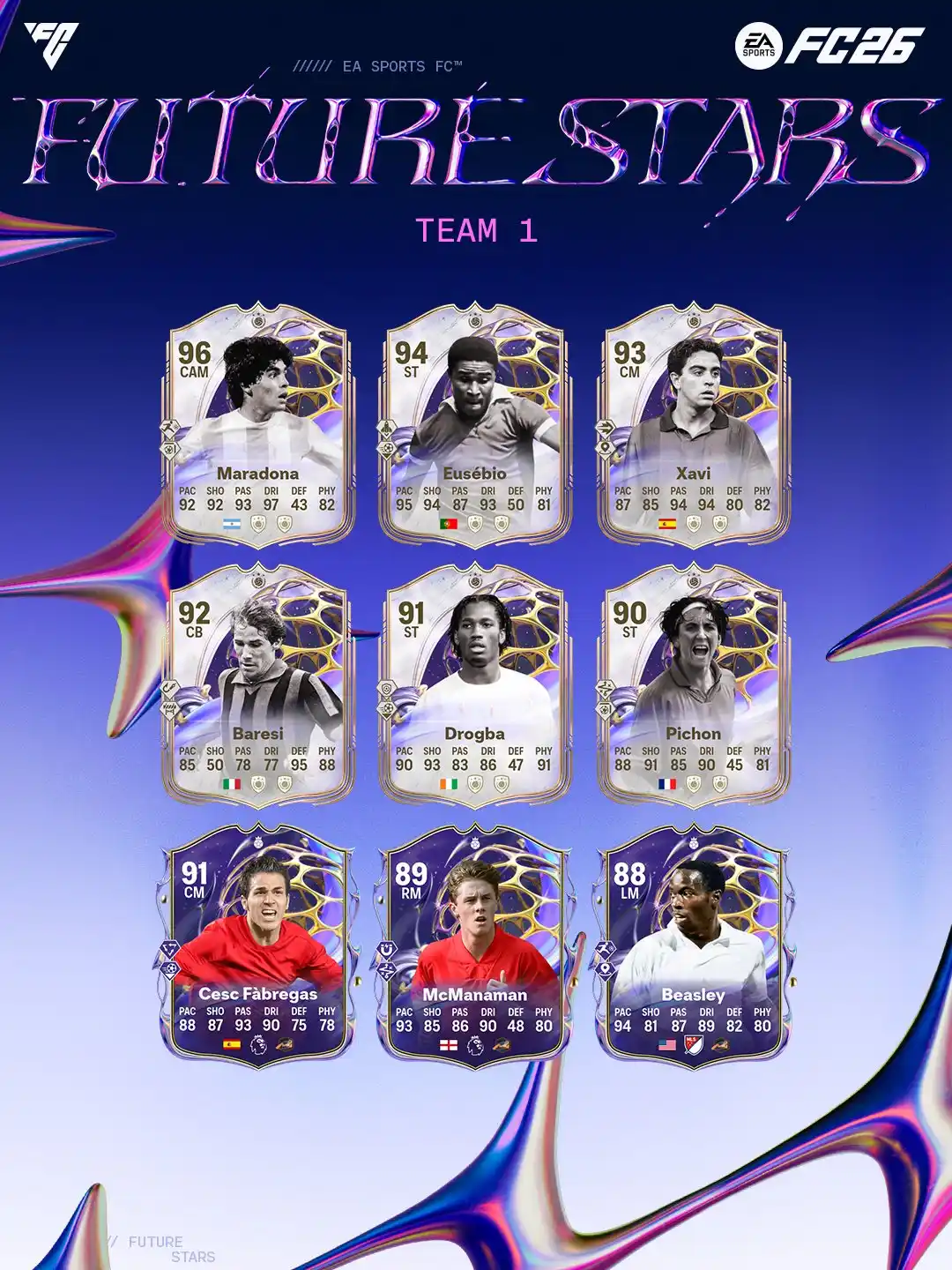 Pela primeira vez, Craques do Futuro recebe Heroes para celebrar a excelência jovem, destacando futebolistas que brilharam cedo nas suas carreiras e rapidamente se tornaram figuras de referência. À frente do pelotão, Micah Richards e Cesc Fàbregas chegam como novos Future Stars Heroes no EA SPORTS FC™ 26, com Richards disponível como recompensa SBC desde o primeiro dia do evento.
