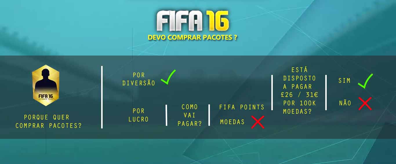 A compra de pacotes pode ser feita com recurso a moedas ou a FIFA Points. No primeiro caso a sua expetativa é a de receber cartas cujo valor de mercado seja superior ao preço dos pacotes. Ou seja, você espera que ao vender no mercado de transferências as cartas dos pacotes, venha a receber mais moedas do que aquelas que pagou por esses pacote. Noutras palavras, espera obter lucro. Isso raramente acontece, pelo que investir as suas coins em packs é uma péssima ideia.